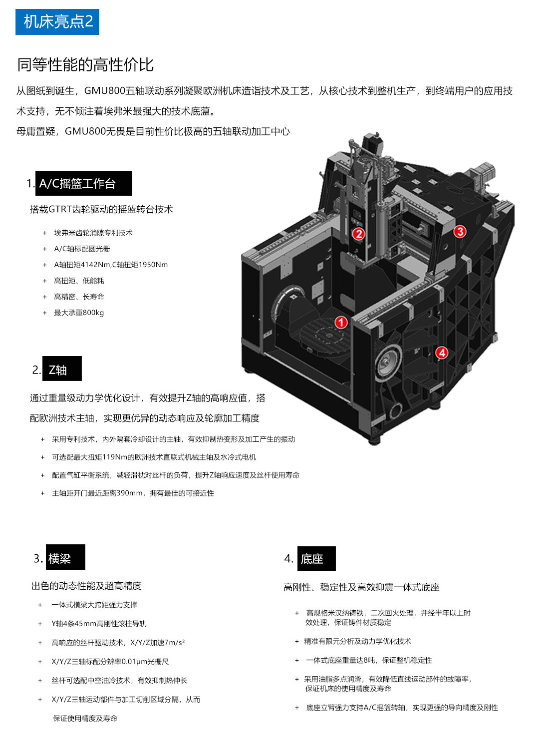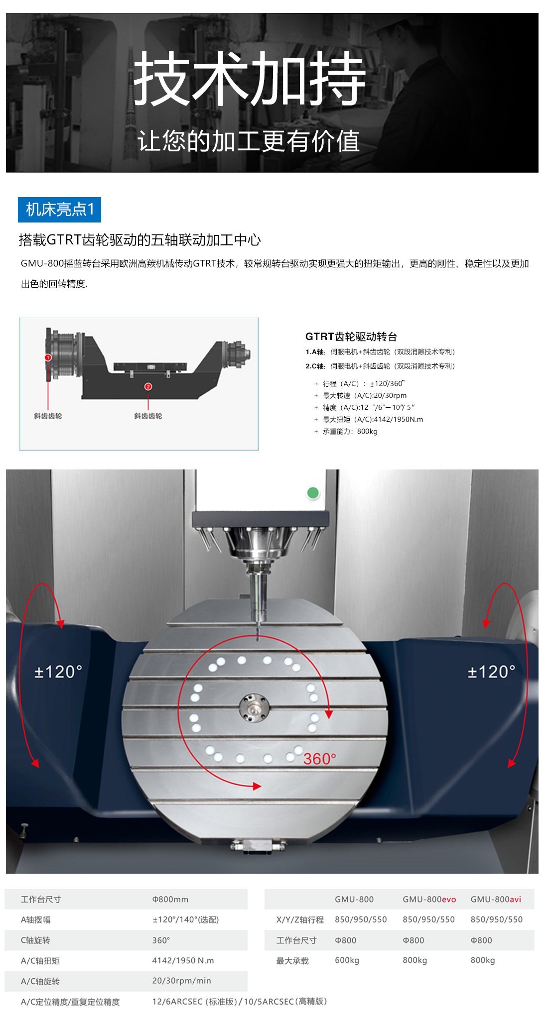 GMU-800高剛性五軸聯動加工中心技術規(guī)格名稱單位GMU-800GMU-800evoGMU-800avi系統(tǒng)(控制單元)SIEMENS-840DSIEMENS840D/HEIDENHAIN-iTNC640HEIDENHAIN-iTNC640X/Y/Z軸行程mm850/950/550850/950/550850/950/550A/C軸行程度±120/360±120/360±120/360主軸端面至工作臺距離(A軸位于0度位置時)mm180-730180-730180-730工作臺尺寸MmΦ800Φ800Φ800最大承重kg600800800主軸主軸(標配)主軸最高轉速/錐柄rpm15000HSK-A6320000HSK-A6312000HSK-A63主軸功率(S1/S6-40%)KW18/2229/3615.5/21.7扭矩(S1/S6-40%)N.m57/7069.9/87.585/119進給系統(tǒng)X/Y/Z軸快速位移m/min40/40/40-32/32/3240/40/40-32/32/3220/20/20最大切削進給率m/min202010A/C軸快進速度rpm20/3020/3020/30定位精度/重復定位精度(GB17421.22000)X/Ymm0.008/0.0060.007/0.0040.007/0.004Zmm0.007/0.0050.006/0.0040.006/0.004A/CARCSEC12/610/510/5自動換刀系統(tǒng)刀具數Pcs26T/32T/48T26T/32T/48T26T/32T/48T換刀時間(刀-刀)sec12s12s12s刀具最大長度mm300300300刀具最大直徑/相鄰無刀mmΦ80/Φ120Φ80/Φ120Φ80/Φ120刀具最大重量kg888機床尺寸機床總高mm350035003500占地面積(長X寬)mm24800×39004800×39004800×3900機床凈重kg170001700017000電力需求kw607060